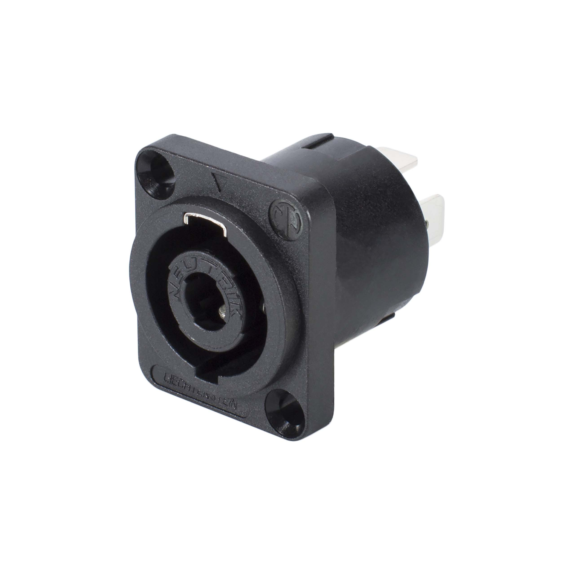 Application: Power, audio Colour: black Model: speakON® Style variant: Type D Gender: male Material: plastic Coding: none Codable: no Pole number: 4-pole Connector / Socket: male connector Type of contact: 3/16" Flat tabs Contact coating: silver plated Mounting: mounting Standards: IEC 62368-1